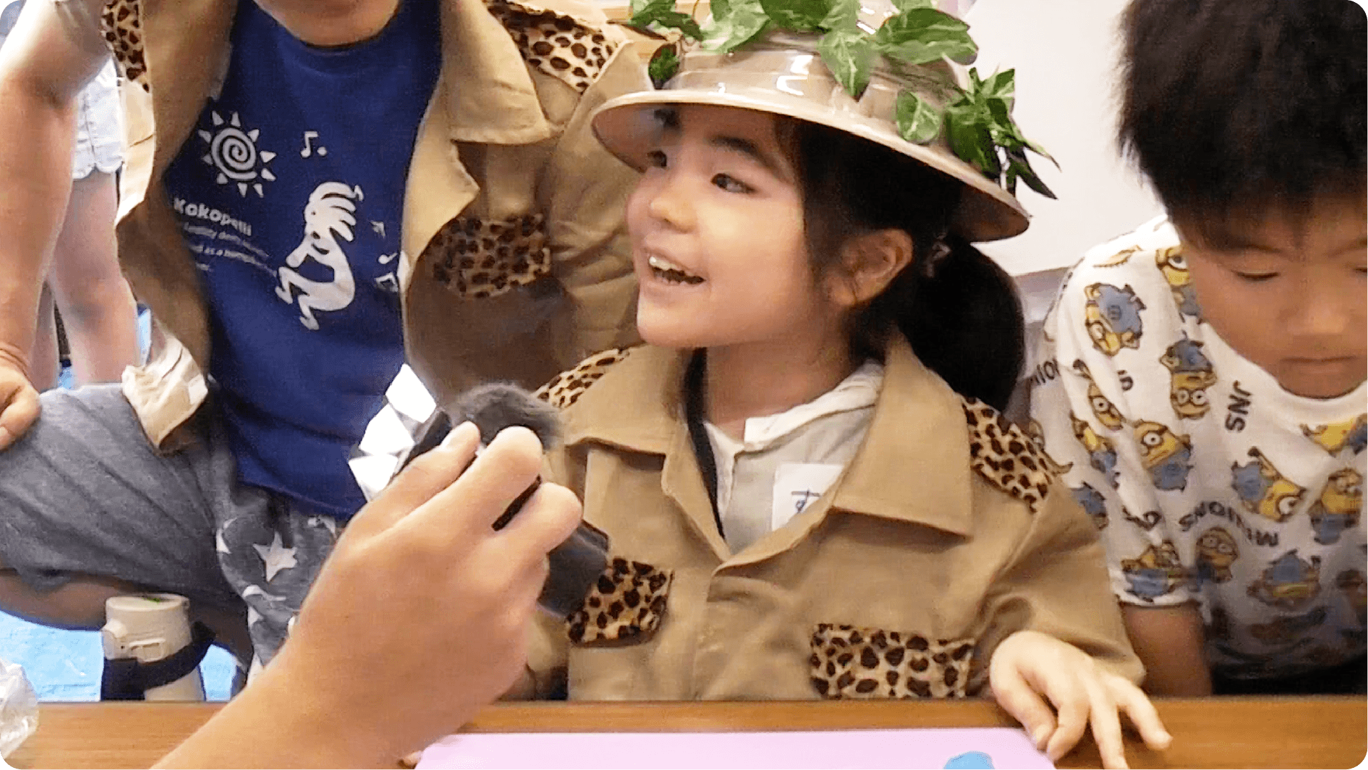 探検隊の衣装を着て「隊長、新種を発見しました!」と報告。非日常の演出が恥ずかしさをワクワクに変え、自分の作品と言葉に自信を持つきっかけを作ります。