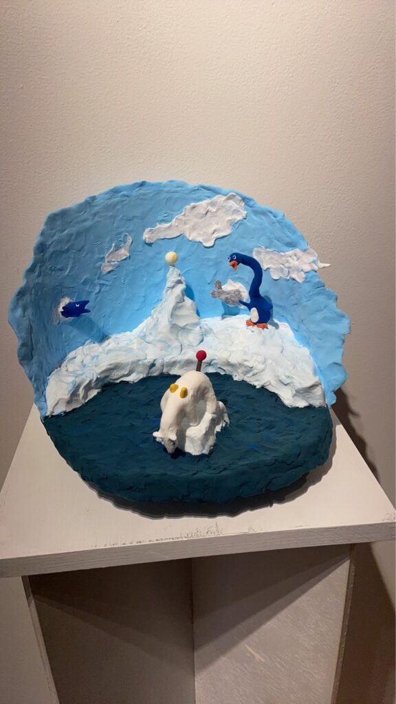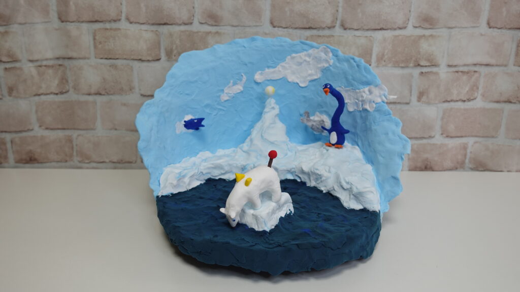 このねんど作品は、シロクマの現在の環境と私の心の動きを象徴しています。シロクマは氷の上でアザラシを待ち伏せして捕食しますが、温暖化による氷の減少で狩場を失い、食料を得られない危機に直面しています。同様に、私は今の仕事に未来を見出せず、今年初めから「ねんど作家として活動しよう」と決意して歩み始めました。しかし、その一歩は小さく、思うように広がっていませんでした。