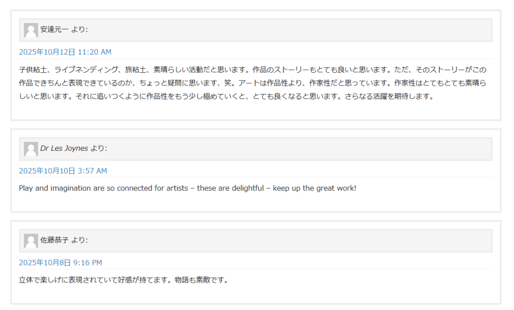 私は、生き物たちの魅力と、人との出会いから生まれる特別な瞬間を、ねんどを通じてユーモアを交えて表現しています。生き物が教えてくれる驚きや感動は、私の創作の原点です。私の作品を見た人が笑ったり、喜んだり、反応してくれること。それが私の創作のエネルギーとなり、次の作品を生み出す力になっています。
